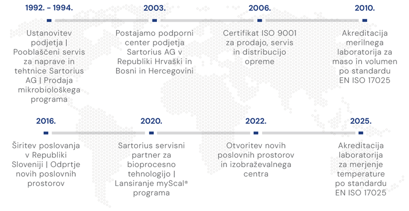 Z razširitvijo proizvodnega asortimana in storitev sta naša prepoznavnost in ugled na trgu nenehno rasla, zato smo leta 2003 postali osrednja točka oziroma podporni center za Sartorius AG na območju Republike Hrvaške in Bosne in Hercegovine. Naše prizadevanje in težnja k brezhibni kakovosti sta bila potrjena leta 2006 s pridobitvijo certifikata ISO 9001 za prodajo, servis in distribucijo opreme za biotehnologijo in mehatroniko (precizne in analitske tehtnice, pipete, dinamične tehtnice, detektorji kovin, industrijske tehtnice, računalniki itd.).