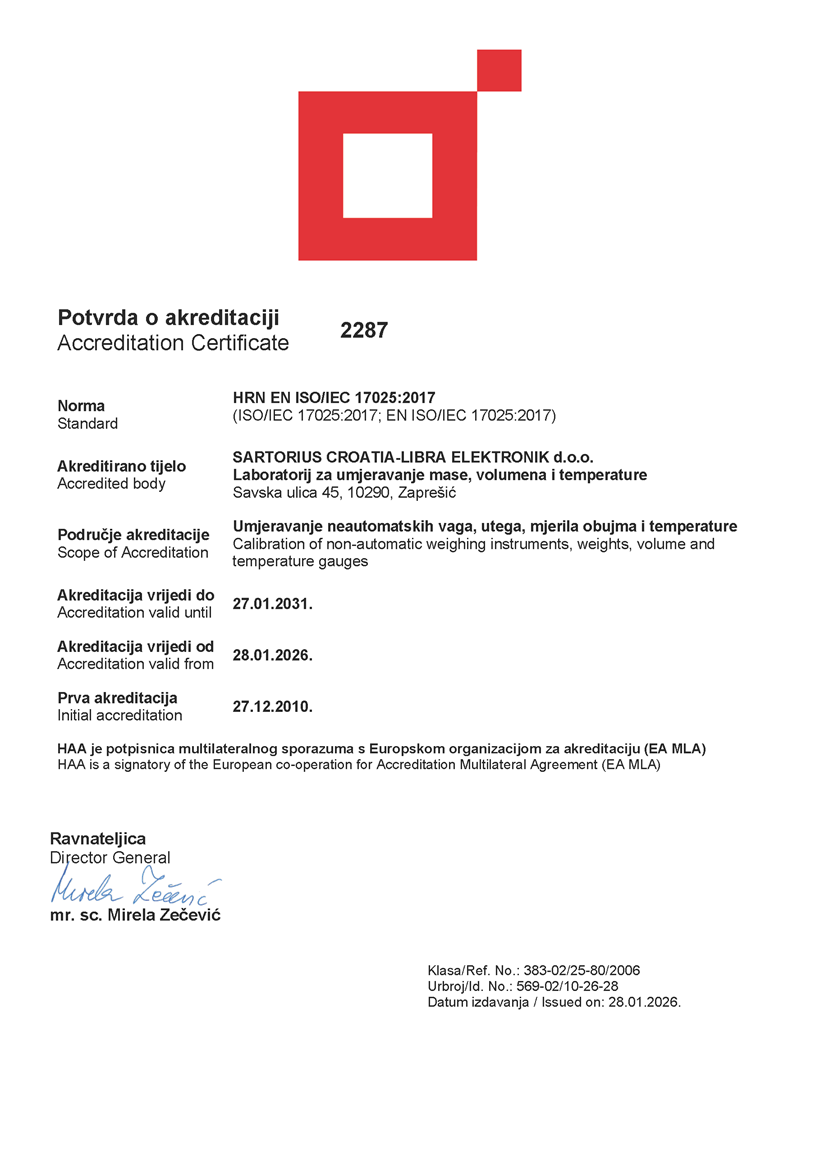 Sartorius Croatia - Libra Elektronik d.o.o., Laboratorij za umerjanje vage, utega, pipete in temperaturnih merilnikov, akreditirani je umjerni laboratorij po normi HRN EN ISO/IEC 17025:2017 od strani Hrvaških akreditacijskih agencij na območju opisan v prilogu Potvrde o akreditaciji številka 2287. Naš laboratorij je začel delovati leta 2010 in od takrat nenehno izboljšujemo svoje storitve in dvigujemo kakovost celotnega poslovanja, z opremo in tehnologijo, ki ustrezata sodobnim zahtevam na področju meroslovja. Leta 2025 bomo razširili obseg dela našega laboratorija na instrumente za merjenje temperature in postali - Akreditirani laboratorij za maso, volumen in temperaturo.